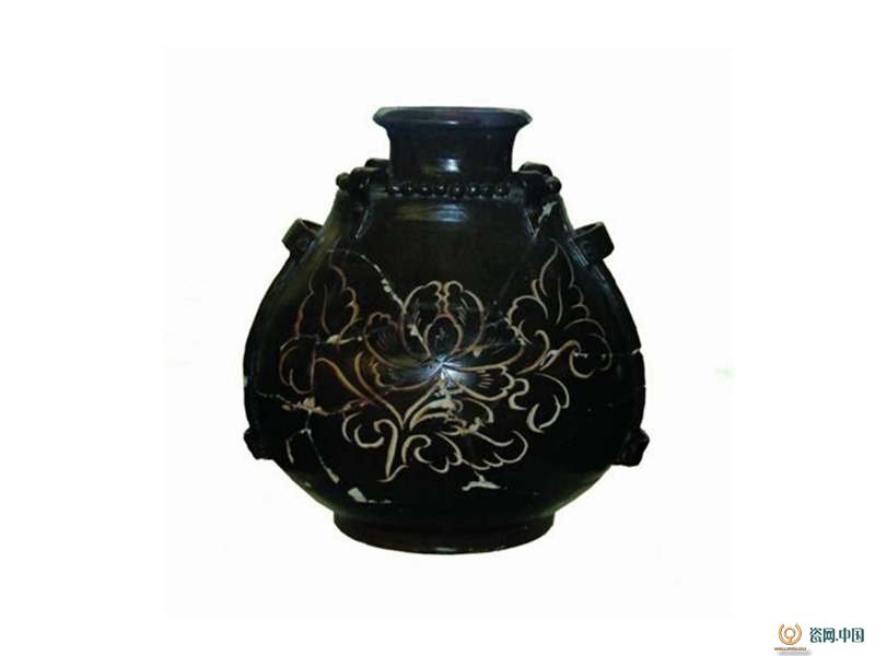 这件石嘴山博物馆收藏的黑釉刻花扁壶,就是用刀刻出的牡丹花纹。此壶高32厘米,肩部有仿制四个耳系周边用圆珠形做装饰,两边安有四个耳系,耳系有铆钉痕迹,腹部用刀刻出牡丹花纹。