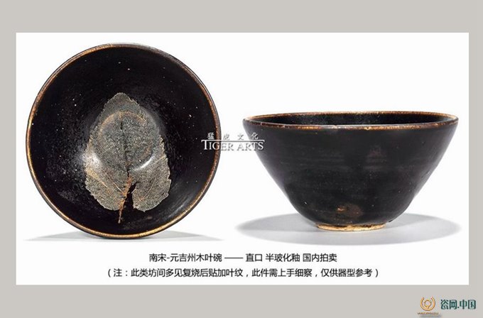 当然,吉州的一些二道窑变釉、贴花、彩绘甚至木叶盏仿造情况在如今市场利益驱动下,仿造水平已相当高,甚至已经侵入很多高端大拍场和一些国内文博展览与研讨会。而坊间在一些纯黑釉老盏上采用中温复窑后加贴木叶的手法(如图31),更是多见,尤要注意。