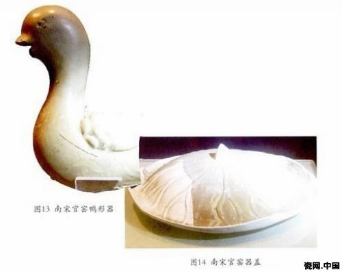 对于宋代官窑瓷器有何纹饰的讨论,因出土瓷器上纹饰的出现而平息。图11是收藏在故宫的北宋官窑弦纹瓶,顾名思义这就是一件带有纹饰的官窑瓶子。图12南宋官窑莲瓣纹碗、图13南宋官窑鸭形器和图14南宋官窑器盖都是出土于杭州的南宋官窑瓷器,在这样几件传世品和出土器面前,恐怕没有人再会说有宋一代的官窑瓷器是没有纹饰的。这些纹饰都有共同的特征,而这些特征又是宋代的艺术氛围和工艺技术所决定的。首先,这些纹饰都采用了模印工艺或贴花工艺,这类工艺在宋代的瓷器制作中已经十分成熟,不要说满足皇家需要的官窑瓷器,即使在民間广泛流行的磁州窑瓷器也运用了这类工艺的成就,也达到了令人惊叹的高度。而这种似隐似现的纹饰表现工艺,不在于绘图技法的娴熟,也不在于纹饰布局的流畅,而在于表现的朦胧和含蓄。这些纹饰都出现在釉下,不是用色彩而是用线条来丰富纹饰所表现的内涵,因此,这种表现手法是宋代文化在陶瓷工艺上的延伸。