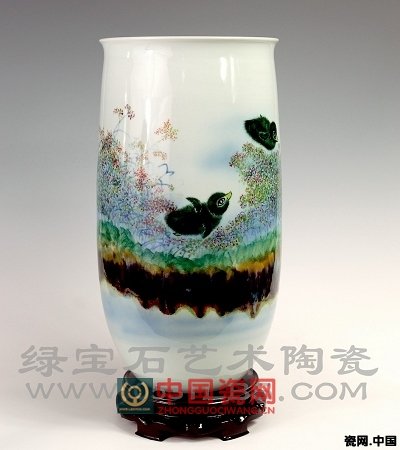 他画的松鼠,精致细腻。形神兼备,既有动物的野性,又有小孩的天真,毛茸茸的小松鼠,灵巧机敏,善良可爱,翘起大尾巴,小眼睛闪着光亮,好像在张开小口和你交谈,真想把它从瓷器上抱下来搂在怀里。还有他画的小鸭,象婴儿一样充满稚气,圆圆的身体,大大的眼睛,象是在思索。他的作品《春江水暖》用青花料和高温色釉综合装饰,小鸭、浮萍的点、线面相呼应,以宽阔的空白展现出瓷器的材质美,又给观赏者以想象的空间。
