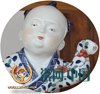 从造型上看,这几个孩子的动作无一处相同,即便同为蹲状,你是两脚分开半蹲的,我是前后弓步斜蹲的。略有相似的是瓷孩子的面容,挂着两片红晕的他们,身着靛朱镶嵌“斗彩”服,没有痴狂的笑,却多平淡的样儿,那份嬉耍的喜悦只是从弯弯的眼角里不经意流出来。原来,精心策划这场“婴戏”图的花甲伉俪,是要让欣赏者从造型之变和斗彩之色中找寻作品的真意。