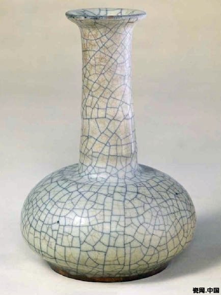 此瓶釉面光亮莹润,通体开细碎鱼子纹,纹片自然美观,别具一格,为典型的哥窑产品。