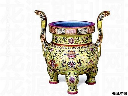故宫博物院藏,炉高27.7厘米,口径17.2厘米,足距13.0厘米。方唇,短颈,扁圆腹,下呈以三兽腿形三足。肩部对称置两耳。炉内施松石绿釉。口沿上以胭脂红彩和蓝彩描绘几何纹。外壁淡绿地洋彩描金装饰,口边绘回纹,一长方形描金框内,自右向左署矾红彩篆体“大清嘉庆年制”6字横款。颈部绘折枝莲纹。肩部绘如意头纹。腹部绘折枝莲托轮、螺、伞、幢、花、罐、鱼、肠八吉祥纹,三足及两耳均绘折枝莲纹。外底中心有一环形凹进,环形区域内以胭脂红地缠枝花纹装饰,底中心以绿地粉彩朵花纹装饰。此种香炉为佛前五供之一,与其配套的还应有花觚一对、烛台一对。