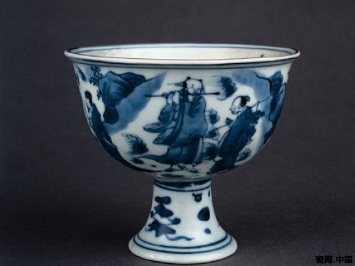 高足杯又称马上杯,它同于高足碗,上为碗形,下有高柄,以元代最为典型。高足杯也称把杯,外观美丽,实用方便。清代朱琰《陶说》卷六《说器中-唐器》之“高足碗”条记:“周羽冲《三楚新录》:高从海时,荆南瓷器皆高足,公私竞置用之,谓之高足碗。”在新石器时代,山东大汶口文化遗址曾出土过一件非常精致的黑陶高足杯。明代以青花高足杯为盛。敞口外撇,深腹内收,喇叭形高足。白胎细腻,釉色青白,青花淡雅鲜艳。腹部装饰青花寿山,宝塔,人物,树枝。明高足杯和碗的广景较大,尤其是高足杯现存有一定数量,品种也多。在造型上与元代有明显的区别。明代高足杯的足均外撇,呈喇叭状。杯与高足柄是用釉粘接,足中空封底心施釉,这是明代高足杯的主要工艺特点。图为宣德青花海水红龙纹,成化斗彩葡萄纹,永乐甜白以及万历青花等。