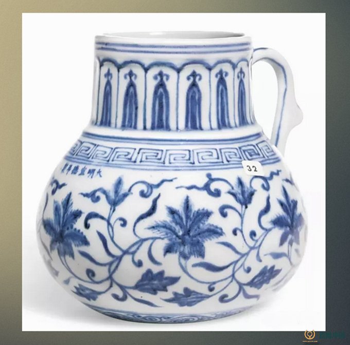 本專場另一十五世紀早期永樂年珍品,則乃明永樂青花花卉錦紋如意耳扁壺。本壺器型及紋飾皆啟發自中東例作,反映當時中國與中東貿易之繁盛,器身精巧幾何紋飾設計,在中國藝術品上未見先例。中華藝匠取可蘭經上紋飾,施於圓拱形器腹,融伊斯蘭六角星圖案入波浪、方勝、蓮紋等中式經典紋飾。