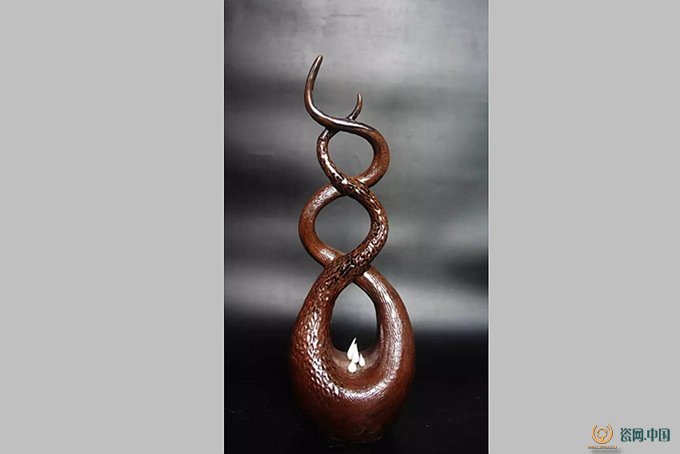 作品《共生》是将自然界中植物生长的状态抽离出来,以缠绕蔓延的形式向上生长,腹部白色部分是对幼芽和水滴的隐喻,表达生命孕育、生长、与水及自然万物之间的关系。是对自然界万物共生和谐融洽状态的陶艺再现。