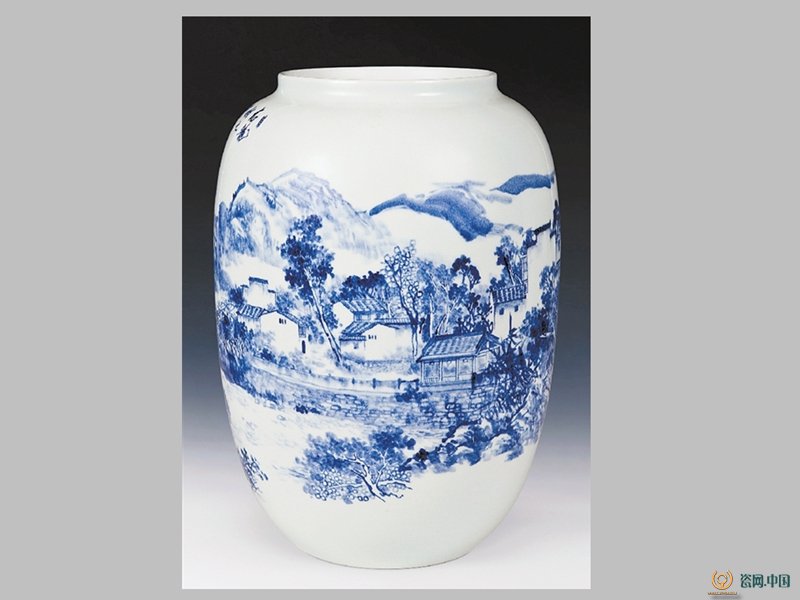作品所记的正是右龙村的美景。静谧的村庄掩映在青山古树秀水中,错落有致的徽派建筑时隐时现,青砖黛瓦与瓷瓶的青花底色相得益彰,南朝沈约的名句“千仞写乔木,百丈见游鳞”正是对此的贴切描绘。