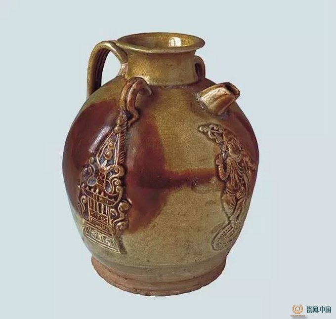 唐长沙窑褐斑贴花舞蹈人物瓷壶