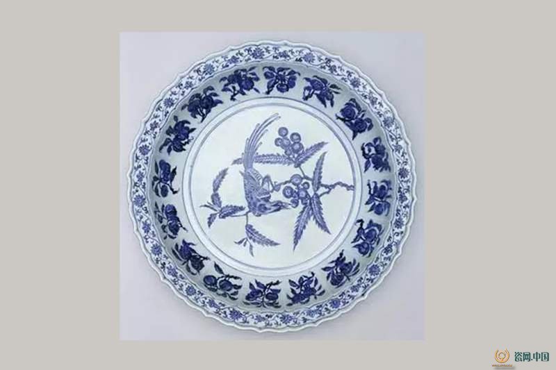 永乐、宣德两朝是我国青花瓷器史上的黄金时代,其青花瓷之胎质、底釉、绘画,无一不精。此盘使用永乐时由西洋进口的“苏泥勃青”料,浓重艳丽,渗入胎骨,并有自然晕散形成的“铁锈斑”,手抚之有凹凸不平之感。国内外现存传世的永乐青花瓷,大盘往往以花卉为装饰题材,用枇杷绶带鸟为主题图案的较少见,就目前已掌握的资料来看,完整的只有三件:日本东京国立美术馆一件,天津艺术博物馆一件,而北京故宫博物院现存的这件最为精美。