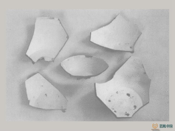 撇口碗:撇口,尖唇,浅腹斜曲。黄白胎或灰胎杂黑色小颗粒。釉白中泛黄或纯白。釉下施化妆土。有的在器足内裸胎上施透明釉。器内有支钉痕。这类碗没有发现印花者,大小也差别不大,在12厘米左右(图三)。
