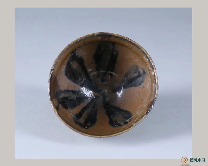 四川地区很早就有烧造白瓷的传统,其烧造历史可追溯至唐代大邑窑[26]。“大邑烧瓷轻且坚,扣如哀玉锦城传,君家白盌胜霜雪,急送茅斋也可怜”,不过目前尚未找到相关窑址。在北宋早中期,白瓷已较为多见,如磁峰窑、瓦岗坝窑等均有发现。到了北宋晚期,其范围更为广泛,重庆地区如瓷窑里、清溪窑等也开始烧制,其器型如碗、盘、碟、盏等,整体看与四川地区较早阶段的同类器形制特征相差不大,两者之间应有着一脉相承的渊源关系。川渝地区的黑釉瓷从北宋晚期才开始出现,在都江堰金凤窑、广元瓷窑铺[27]、乐山西坝[28]、达州瓷碗铺[29]、青神坛罐窑[30]以及重庆涂山窑各窑址中均有大量的出土。上述窑址出土的黑釉瓷中,茶盏是非常重要的瓷器类型,其数量众多,应与两宋时期各阶层皆以饮茶、斗茶为乐的社会风气有很大的关系,其黑釉茶盏也打上了建窑的印记。不过,相较福建建窑,江西吉州窑[31]对重庆涂山窑的影响更为明显。如涂山窑的茶盏主要分为侈口、敛口、弇口、敞口四种,无论形制结构还是尺寸大小均与吉州窑非常接近。此外,木叶贴花是吉州窑非常有特色的产品,它先是在胎体上施淡黄釉, 再把经过处理的落叶脉络贴在釉面上, 然后在器身施上黑釉后入窑烧制而成,与小湾窑址较为独特的花瓣纹(图六、图七)无论纹样特征还是窑变机理均有相似之处。