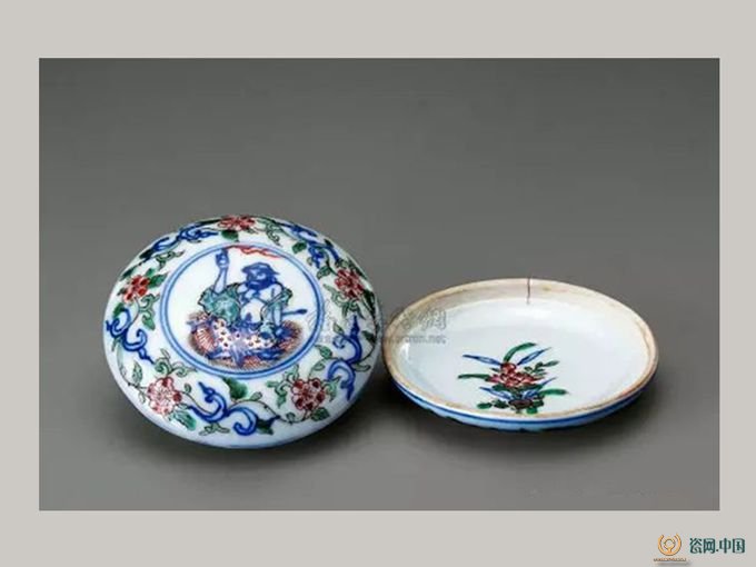 明代 瓷印盒或圆或方,以明中期以后较为常见。青花五彩龙凤纹印盒,方形,直壁。盖面绘有龙凤纹饰,器身绘有两两相对的龙凤纹饰。底有青花双框“大明万历年制”楷款,为万历官窑器物。