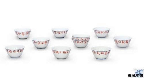 图40、明治 竹轩款 朱砂茶诗文品杯十客