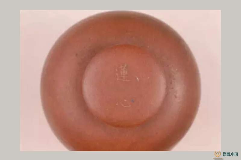 壶阔口,圆肩,扁腹,短直流,粗环柄。盖面突起浮雕的柿蒂纹。浅赭色调砂泥,布满白砂点,砂泥颗粒较粗,但粗而不涩。浮雕的柿蒂纹具有典型的晚明风格,明墓出土的紫砂壶和宜兴窑址出土的残器中多有柿蒂纹装饰的壶流或壶盖。此壶浮雕的柿蒂纹周边翻卷,有一定的厚度,使光洁素雅的壶体增添了圆雕的神韵。