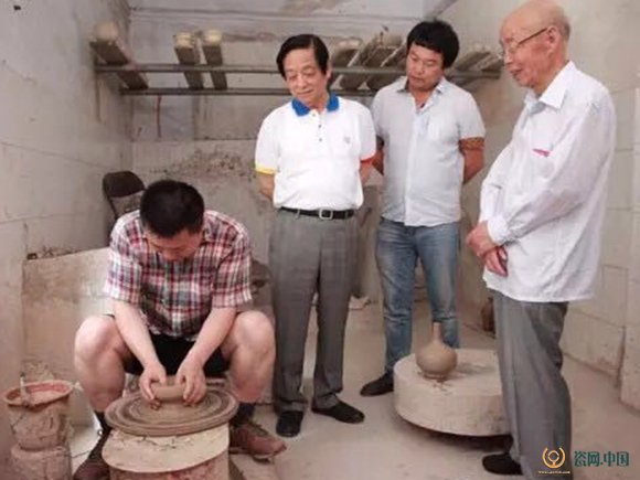 韩美林在苗家钧窑指导工人拉坯盘泥