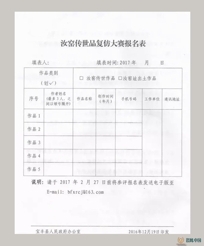 由宝丰县人民政府主办,宝丰县汝窑瓷业保护和发展局、宝丰汝窑博物馆承办,宝丰县汝瓷行业协会协办的汝窑传世品复仿大赛活动将在2017年3月30日开始。
