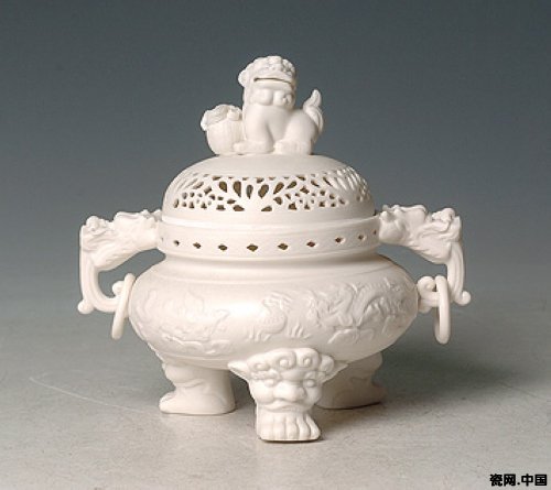 划花技法的应用也很灵巧,除一般花卉图案外,在玩赏品上大多刻划细如蚊足的诗赋文句和印章嵌记,颇具特色,反映士大夫阶层的闲情逸趣。透雕作品则比较少见,一般用于笔筒、熏炉、套杯、狮子、洞箫等,极见工巧,弥足珍贵,清初陆廷灿《南村随笔》云:“德化磁箫,色莹白,式亦精好,但百枝中无一二合调者,合则其声凄朗,远出竹上,不意云梦柯亭之外,有此异种。”故宫博物院收藏的一件明德化窑瓷箫,式样的精美和质感的强烈,使人们不必考虑音响的效果而流连不已。