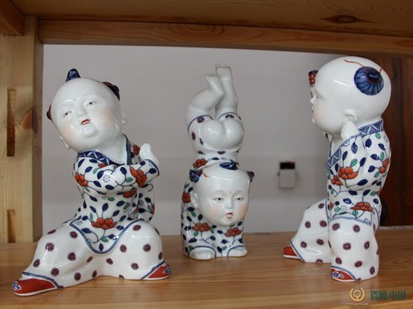 十个不同的作品拥有不同造型,有半蹲张望的、起舞弄袖的、盘坐捧鸟嬉戏的、有倒立练绝活的、有捂耳点鞭炮的,还有趴着晃脑袋的。略有相似的是瓷孩子的面容,挂着两片红晕的他们,身着靛朱镶嵌“斗彩”服,没有痴狂的笑,却多平淡的样儿,那份嬉耍的喜悦只是从弯弯的眼角里不经意流出来。精心策划这场“婴戏”图的花甲伉俪,是要让欣赏者从造型之变和斗彩之色中找寻作品的真意。