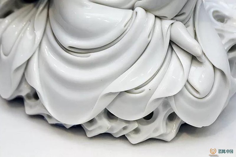 德华白瓷的胎骨细柔坚致,俗称“糯米胎”,带有晶莹的光泽,釉水洁净匀厚与胎骨浑然一体。能够呈现出温润的玉质感。衣纹皱褶如风如水如煮熟的饺子皮,千回百转美得惊心动魄。动态十足。五百年来,明代中期称得上是德化瓷塑艺术的巅峰。