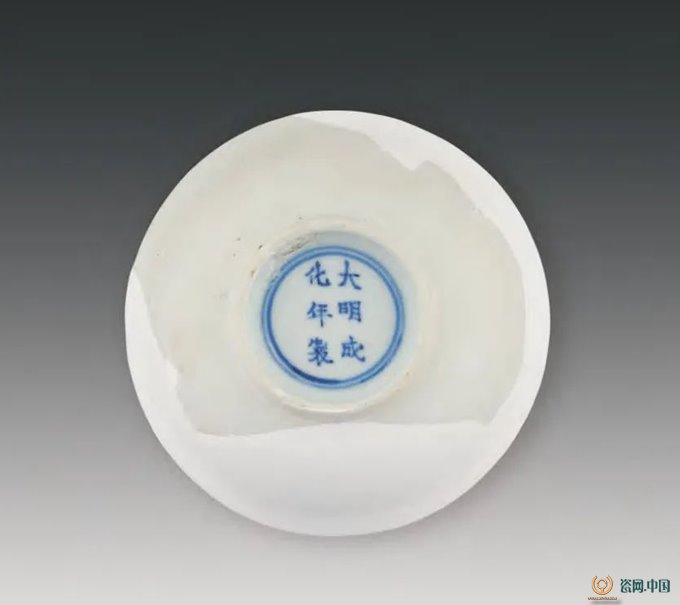 更为重要的考古发现来自落马桥窑址,其位于镇区南部(图三)[13]。2012~2014年,景德镇市陶瓷考古研究所等单位联合对该窑址进行了考古发掘,清理出北宋后期至清末的遗存。落马桥窑址是目前在镇区范围内发掘的遗存年代跨度最长、出土遗物最为丰富的一处民窑遗址。尤其是窑址内明清时期地层连续,遗迹、遗物丰富,填补了多项空白,对于了解镇区内民间窑场的发展脉络具有十分重要的意义。此次发掘共出土了152件(片)嘉靖时期的彩釉瓷半成品[14],主要出土于第四期(嘉靖至崇祯时期)地层[15]。这些半成品的器类有碗(图四)、盘(图六)、杯(图八)三种(图一四),器身均素胎,器底以青花书年号款,经施釉后高温烧成。足底的青花款识有三种:第一种是“大明嘉靖年制”款(图七),为常见的双行六字楷书款(图一一)[16];第二种是钱币式的“嘉靖年制”款(图九),相对少见[17];第三种是“大明成化年制”的仿款(也称“寄托款”)(图五)。