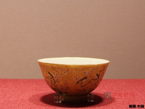 10、清 同治黄地粉彩喜鹊梅花纹碗